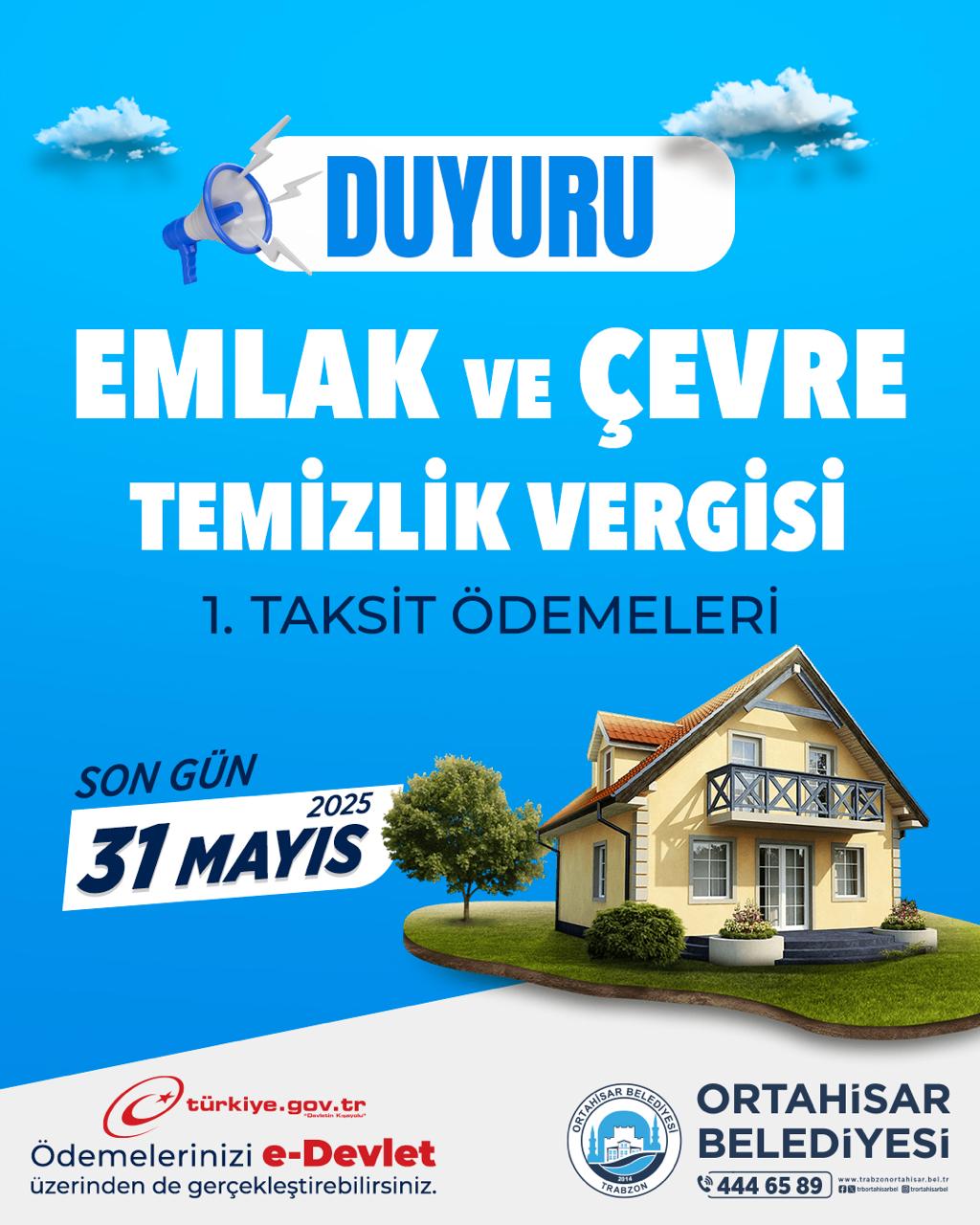 “Belediyemizin önemli gelir kaynaklarından olan Emlak Vergisi, Çevre Temizlik Vergisi ve İlan Reklam Vergisi ilk taksitlerinin ödeme süresi, 31 Mayıs Cumartesi günü sona erecektir. Belediye hizmetlerinin aksamadan yerine getirilmesi, mükelleflerimizin yükümlülüklerini zamanında, tam ve eksiksiz yerine getirmeleriyle mümkündür. Vatandaşlarımızdan tahsil edilen vergi ve diğer gelirler, yine vatandaşlarımıza hizmet olarak geri dönmektedir. Bu nedenle mükelleflerimizin belirtilen süre içinde ödemelerini yapmaları hem hizmetlerin aksamaması hem de gecikme faizine maruz kalmamaları açısından önem taşımaktadır. Mükelleflerimiz vergi ödemelerini belediye veznelerinden, e-devlet sistemi üzerinden, e-belediyecilik uygulaması kapsamında internet üzerinden www.trabzonortahisar.bel.tr web adresinden veya Türkiye’nin her yerindeki PTT şubelerinden mükellef sicil numarası ve TC kimlik numarasıyla anlaşmalı kredi kartları, banka kartları veya banka hesaplarından yapabilmektedir. Vatandaşlarımıza, gösterdikleri hassasiyet için teşekkür ederiz”