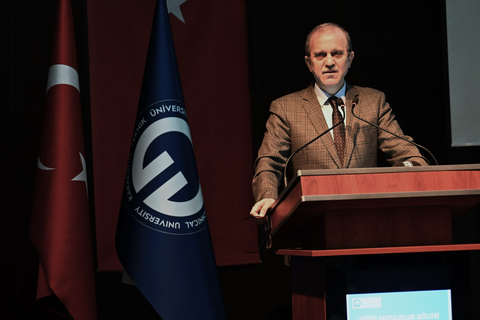 KTÜ Rektörü Prof.Dr. Hamdullah Çuvalcı sözlerine Kanuni Sultan Süleyman’ın ünlü beyti "Halk içinde muteber bir nesne yok devlet gibi olmaya devlet cihanda bir nefes sıhhat gibi…" sözleriyle başlayarak katılımcılara hitabında, "Malumunuz tıp dünyası, her geçen gün gelişen bilgi ve teknolojiler ile daha güçlü hale gelirken özellikle Acil Tıp ve Göğüs Hastalıkları gibi kritik alanlarda, bilgi ve deneyim paylaşımı büyük bir önem taşımaktadır. Hastalarımıza, en doğru ve hızlı müdahaleyi yapabilmek için teorik bilgilerin, sahadaki deneyimler ile harmanlanması gereklidir. Bu doğrultuda 'Gerçek Olgular ve Deneyimlerle' başlığı altında düzenlenen bu sempozyumun, akademisyenlerimiz ve bu alanda çalışan sağlıkçılarımız için büyük bir fırsat sunduğuna inanıyorum” ifadelerini kullandı.