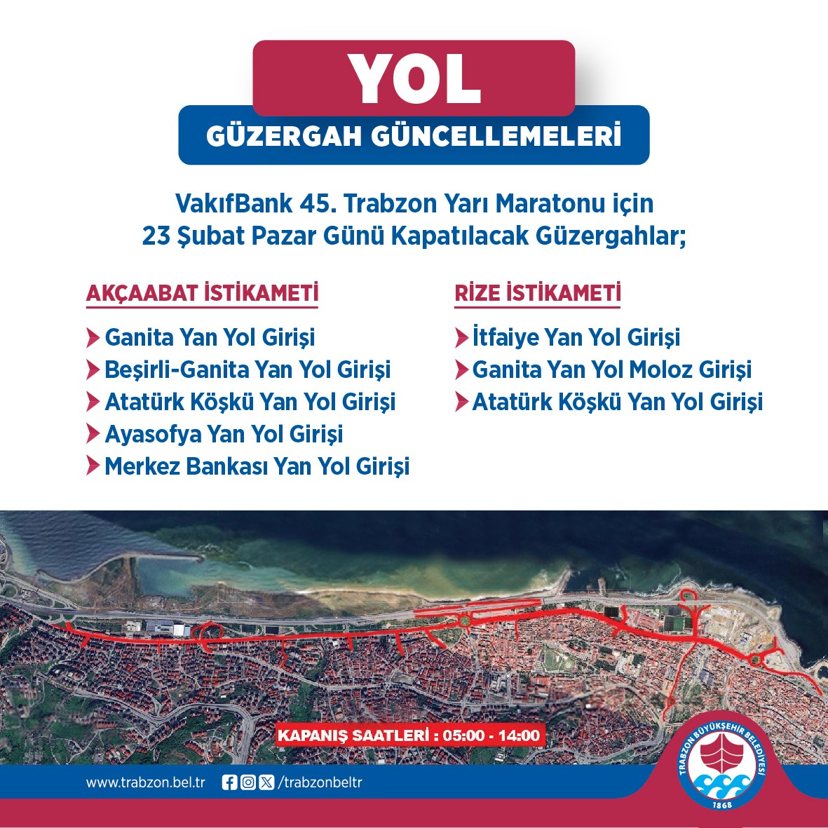 Büyükşehir Belediyesi’nin ev sahipliğinde, Valilik, Gençlik ve Spor İl Müdürlüğü ile Türkiye Atletizm Federasyonu'nun destekleriyle 23 Şubat Pazar günü gerçekleştirilecek olan VakıfBank 45. Uluslararası Trabzon Yarı Maratonu nedeniyle trafiğe kapatılacak yollar açıklandı. "Her Adımda Barışa Koş" mottosuyla düzenlenen yarı maraton için Pazar günü sabah 05.00 ile 14.00 saatleri arasında, Akçaabat istikametinde Ganita, Beşirli-Ganita, Atatürk Köşkü, Ayasofya ve Merkez Bankası yan yol girişleri trafiğe kapalı olacak. Rize istikametinde ise Trabzon İtfaiyesi, Ganita ve Atatürk Köşkü yan yol girişleri kapatılacak.