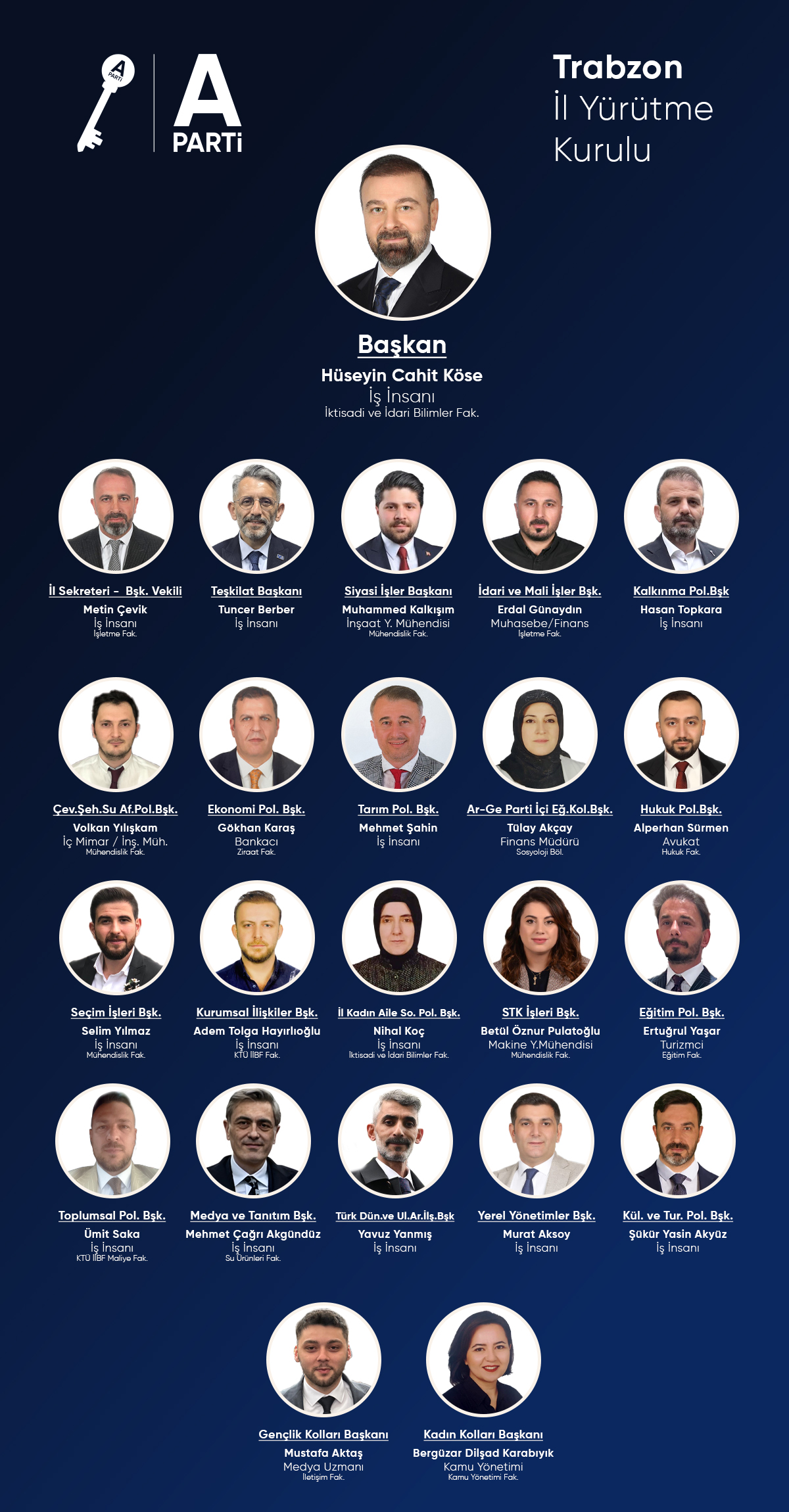 Anahtar Parti Trabzon İl Başkanı Hüseyin Cahit Köse, yeni Yürütme Kurulunu açıkladı. Yürütme kurulunda görev değişiklikleri yapıldı. Yönetim Kurulu Toplantısı sonrası açıklama yapan İl Başkanı Hüseyin Cahit Köse, teşkilat olarak ilkeli, şeffaf ve parti içi ihtiyaçları gözeten bir anlayışla çalışmalarını sürdürdüklerini belirterek, “Genel Başkanımız Yavuz Ağıralioğlu'nun da vurguladığı ‘Daha İyisi Mümkündür’ şiarıyla bizler de teşkilatımız için aynı hassasiyetleri taşıyoruz” dedi.