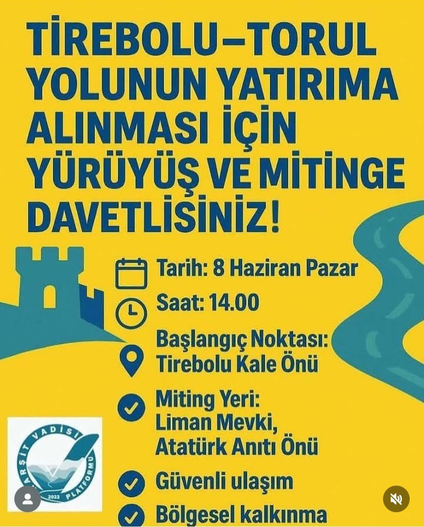 Doğu Karadeniz ile Doğu Anadolu'yu birbirine bağlayan güzergâhlardan biri olan Tirebolu-Torul Yolu’nu bölge halkı gündemden düşürmüyor. Yıllardır yatırım programına alınması beklenen yol için vatandaşlar bu kez seslerini daha güçlü duyurmak için miting düzenleyecek. Bayramın üçüncü günü olan 8 Haziran Pazar günü saat 14.00’te Tirebolu Kale önünde toplanacak olan yöre halkı yürüyüş yapacak. Liman Mevkii Atatürk Anıtı önünde ise bir miting düzenlenecek. ‘Güvenli Ulaşım ve Bölgesel Kalkınma’ hedefiyle yola çıkan yöre halkı, uzun süredir yatırım programına alınmayan güzergaha artık bir çekidüzen verilmesini istiyor. Mitinge ilişkin yapılan duyuruda, “8 Haziran günü bayram havasında bir miting yapmaya ne dersiniz? Evet diyorsanız sizi Tirebolu’ya bekliyoruz. Kale’de toplanıp yürüyeceğiz... Yolumuz yapılsın, canlar üzülmesin” ifadeleri kullanıldı.