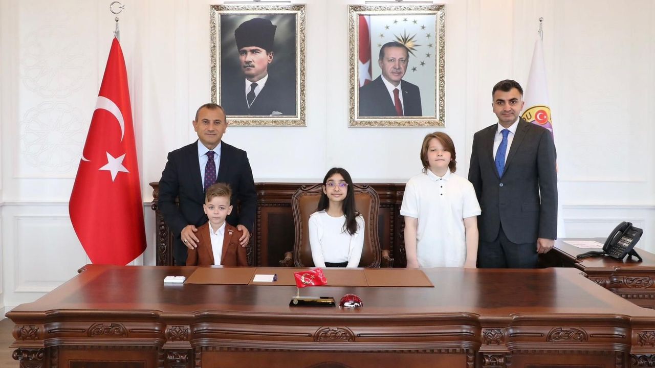 Ziyarette, tüm çocukların 23 Nisan Ulusal Egemenlik ve Çocuk Bayramı’nı kutlayan Vali Tuncay Sonel, makam koltuğunu sırayla Yaren Erva Hatipoğlu, Çağan Kemal Demirer ve Yiğit Efe Bayram’a devretti.