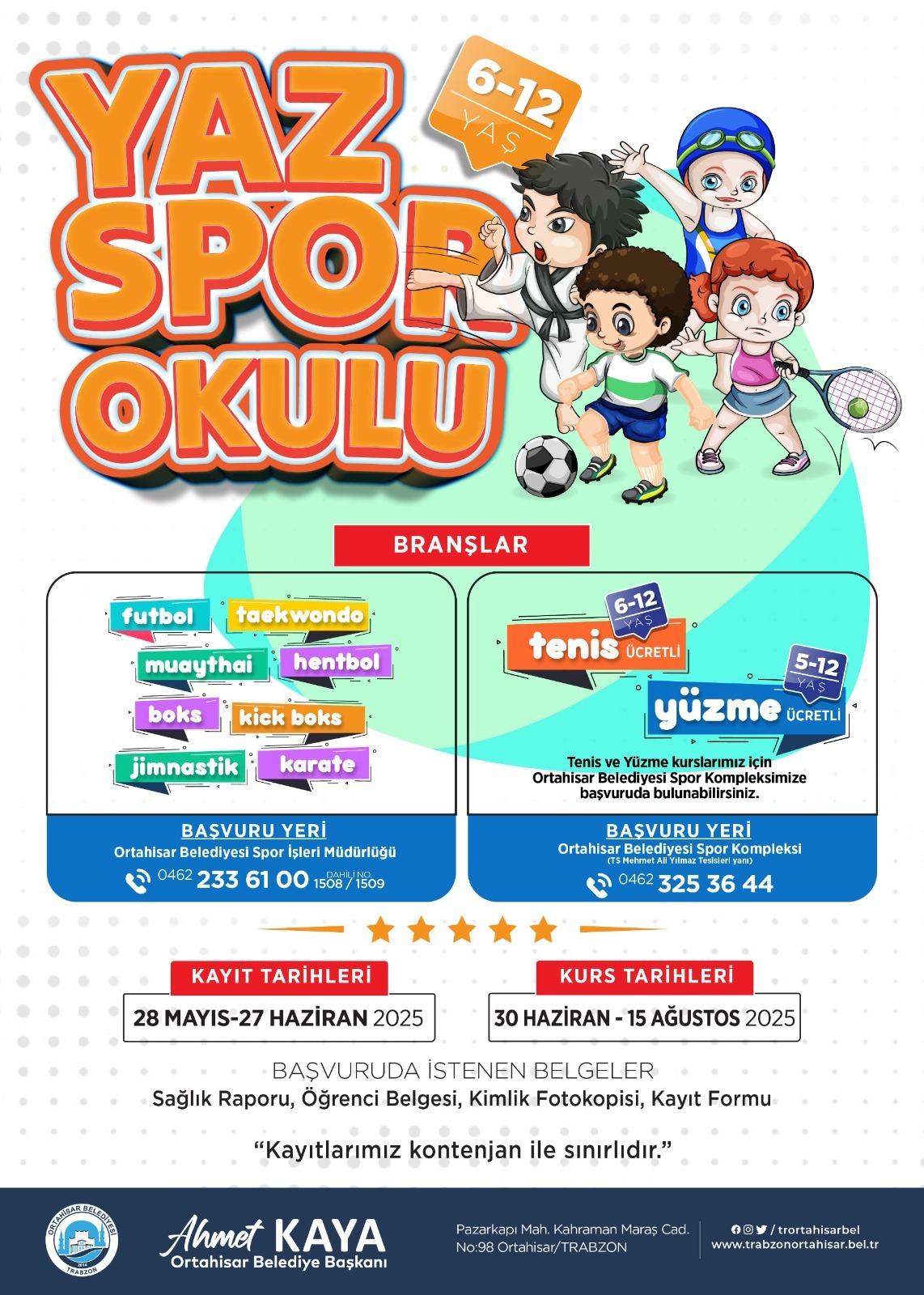 Sporun, çocukların fiziki gelişimi için çok önemli olduğunu belirten Ortahisar Belediye Başkanı Ahmet Kaya, “Birçok spor dalında çok başarılı sporcular yetiştiren şehrimizde, genç yetenekleri spora kazandırmak için her yıl ‘Yaz Spor Okulu’ düzenliyoruz. Spor, çocuklarımızın ve gençlerimizin sağlıklı gelişimi ve sosyalleşmesi açısından da çok önemli. Eğitimlerin deneyimli antrenörler tarafından verileceği Yaz Spor Okulu’muzda çocuklarımız, bir yandan serbest zamanlarını değerlendirebilecek bir yandan da sevdikleri spor branşında kendilerini geliştirebilme imkânına kavuşacaklar. Bütün çocuklarımızın yaz spor okulumuza katılımını bekliyoruz” dedi.