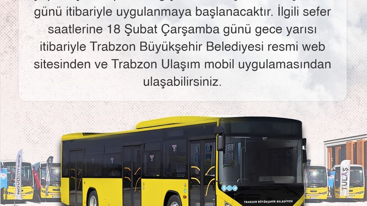 Trabzon Büyükşehir Belediyesi bünyesinde hizmet veren Trabzon Ulaşım A.Ş. (TULAŞ), Ramazan ayı boyunca vatandaşların iftar saatlerinde ulaşımda herhangi bir aksaklık yaşamaması amacıyla otobüs sefer saatlerinde düzenleme yaptı. Özellikle iftar öncesi ve sonrası yoğunluk dikkate alınarak hat ve saatlerde güncellemeler gerçekleştirildi. Yeni sefer saatleri yarından (19 Şubat Perşembe) itibaren uygulanmaya başlanacak. Vatandaşlar, güncellenen sefer saatlerini bu gece yarısından itibaren Trabzon Büyükşehir Belediyesi resmi web sitesi trabzon.bel.tr ile Trabzon Ulaşım mobil uygulaması üzerinden öğrenebilecek. Büyükşehir Belediyesi’nden yapılan açıklamada, "Ramazan ayı boyunca vatandaşlarımızın ulaşımda herhangi bir mağduriyet yaşamaması için süreci yakından takip edecek, ihtiyaç duyulması halinde ilave düzenlemeleri hayata geçireceğiz. Tüm hemşehrilerimize hayırlı ve bereketli bir Ramazan diliyoruz” denildi.