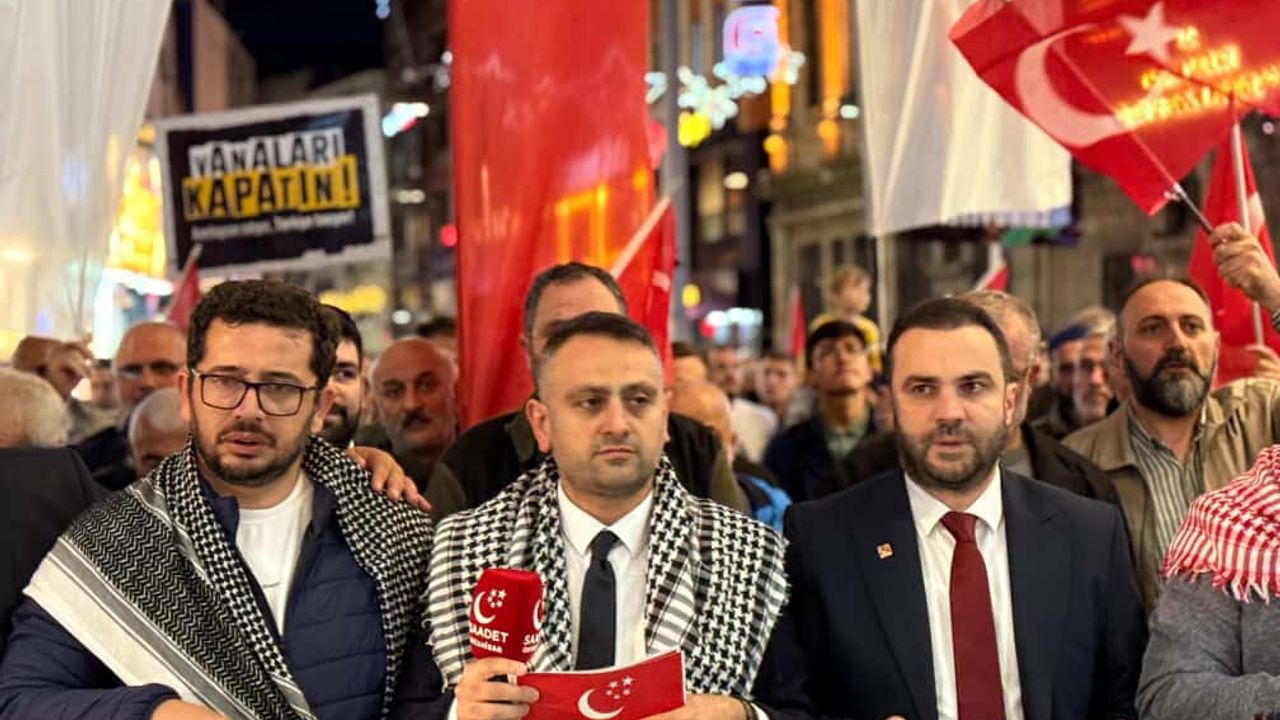 İsrail'in Sumud Filosu’na düzenlediği operasyonu kınamak amacıyla yürüyüş düzenleyen Saadet Partisi Ortahisar ilçe yönetimi meydan parkında basın açıklaması yaptı.