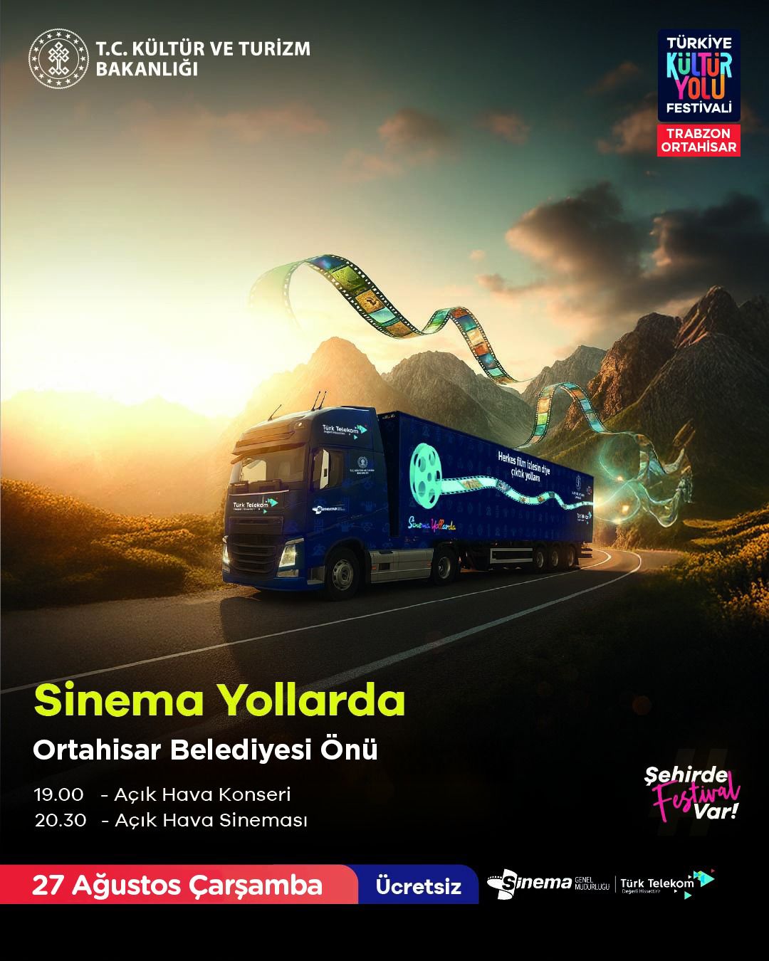 Kültür ve sanatı toplumun her kesimine ulaştırmak ve sinemanın birleştirici gücünü her yaş grubuyla buluşturmak amacıyla Kültür ve Turizm Bakanlığı ile Türk Telekom ortaklığında hayata geçirilen ‘Sinema Yollarda’ tırı, yarın akşam Ortahisar Belediyesi önünde izleyicilerle buluşarak müzik ve sinema dolu bir akşam yaşatacak.