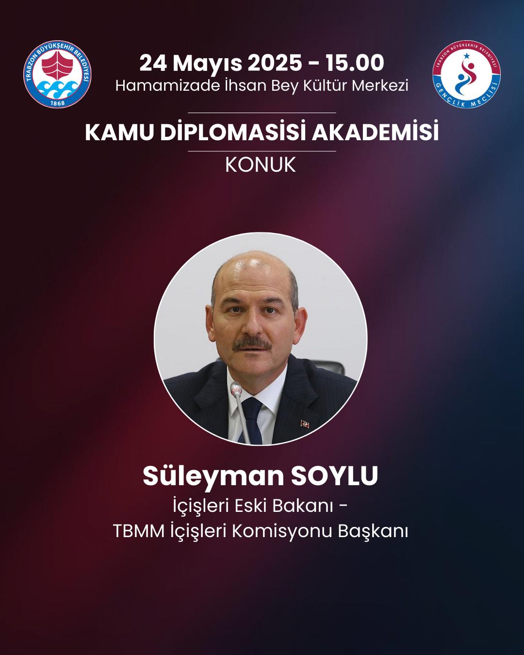 Trabzon Büyükşehir Belediyesi Gençlik Meclisi'nin, gençlerin kişisel ve akademik gelişimine katkı sunmak amacıyla hayata geçirdiği Gençlik Akademileri, önemli isimleri gençlerle buluşturmaya devam ediyor. Bu kapsamda, önceki dönem İçişleri Bakanı ve TBMM İçişleri Komisyonu Başkanı Süleyman Soylu, yarın Trabzon’a gelerek Gençlik Meclisi’nin düzenlediği özel programda gençlerle buluşacak. Hamamizade İhsan Bey Kültür ve Sanat Merkezi’nde saat 15.00’da başlayacak etkinlikte Soylu, kamu diplomasisi üzerine birikimlerini paylaşacak. Uzun bir aranın ardından Trabzon’a gelecek olan Süleyman Soylu’nun, şehirde çeşitli ziyaretlerde bulunması da bekleniyor.