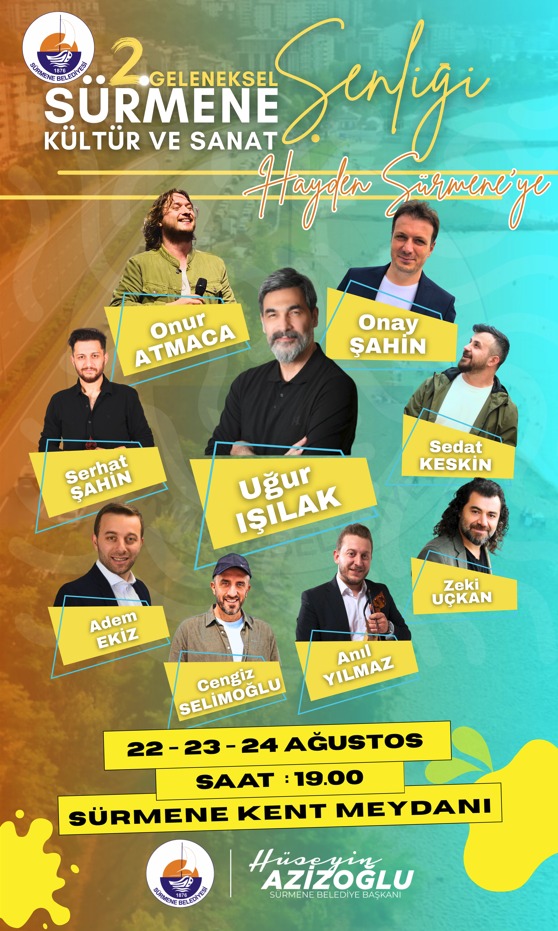 Sürmene Kent Meydanı’nda düzenlenecek konserlerde 22 Ağustos Cuma günü Onur Atmaca, Cengiz Selimoğlu, Adem Ekiz; 23 Ağustos Cumartesi Günü Uğur Işılak, Serhat Şahin, Sedat Keskin; 24 Ağustos Pazar günü Onay Şahin, Zeki Uçak ve Anıl Yılmaz sahne alırken, kültür turu, çocuklar için özel atölyeler ve eğlenceli etkinlikler düzenlenecek.