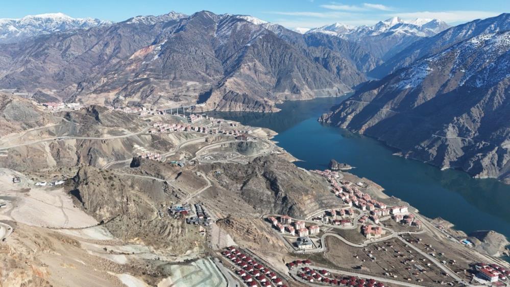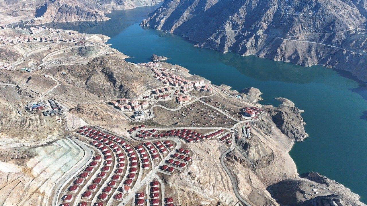 Artvin’in Yusufeli ilçesinde Yusufeli Barajı ve HES projesi nedeniyle sular altında kalan eski yerleşim yerleri arasında bulunan Tekkale Köyü, yeni yerleşim alanında villa tipi köy evleriyle dikkat çekiyor. Göl manzarasına sahip modern evler, çevre düzenlemesiyle birlikte havadan drone ile görüntülendi. Yeni yerleşim yerinde, bölgenin doğal dokusuna uyumlu olarak tasarlanan evler, baraj gölüne hâkim bir noktada inşa edildi.