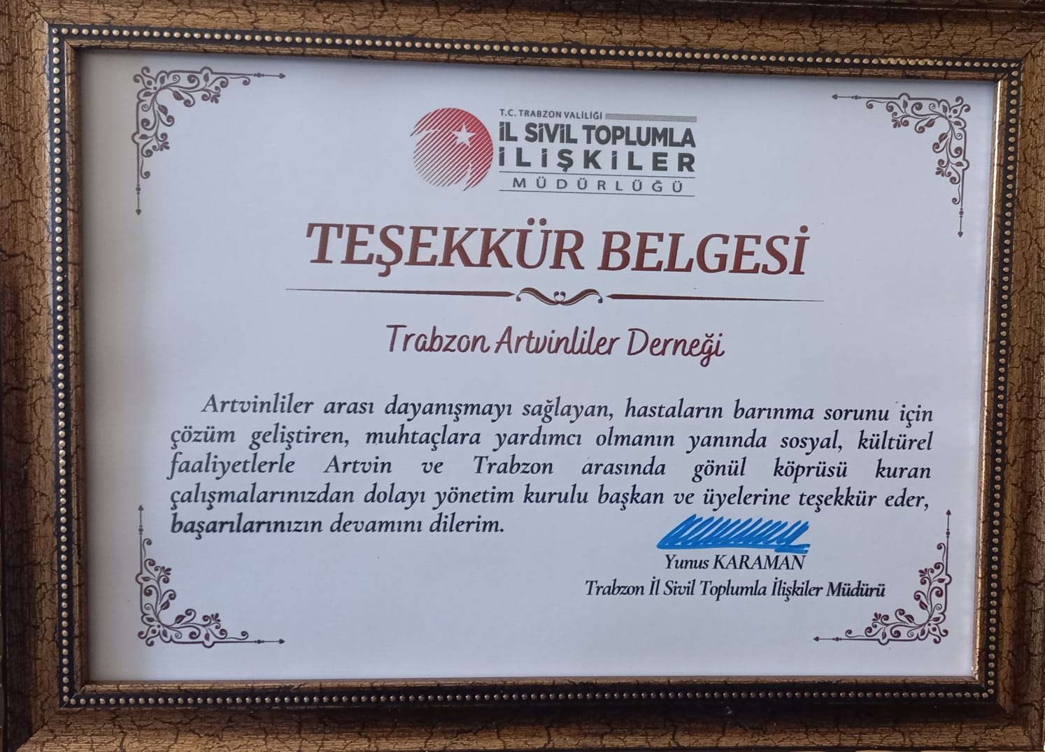 Trabzon İl Sivil Toplumla İlişkiler Müdürü Yunus Karaman tarafından Trabzon Artvinliler Derneği Başkanı Ahmet Külekçi'ye takdim edilen "Teşekkür Belgesinde" şu ifadeler yer aldı "Artvinliler arasında dayanışmayı sağlayan hastaların barınma sorunu için çözüm geliştiren muhtaçlara yardımcı olmanın yanında sosyal kültürel faaliyetlerle Trabzon ve Artvin arasında gönül köprüsü kuran çalışmalarınızdan dolayı yönetim kurulu başkan ve üyelerine teşekkür eder başarılılarınızın devamını diliyorum"