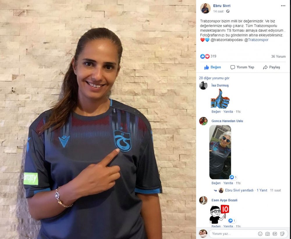 Trabzon Tabip Odası Başkanı Dr. Ebru Sivri, sosyal medya hesabından keşan desenli formayla fotoğrafının bulunduğu bir duyuru paylaştı. Sivri, duyuruda, “Trabzonspor bizim milli bir değerimizdir. Ve biz değerlerimize sahip çıkarız. Tüm Trabzonsporlu meslektaşlarımı Trabzonspor forması almaya davet ediyorum. Fotoğraflarınızı bu gönderinin altına ekleyebilirsiniz” ifadesini kullandı.