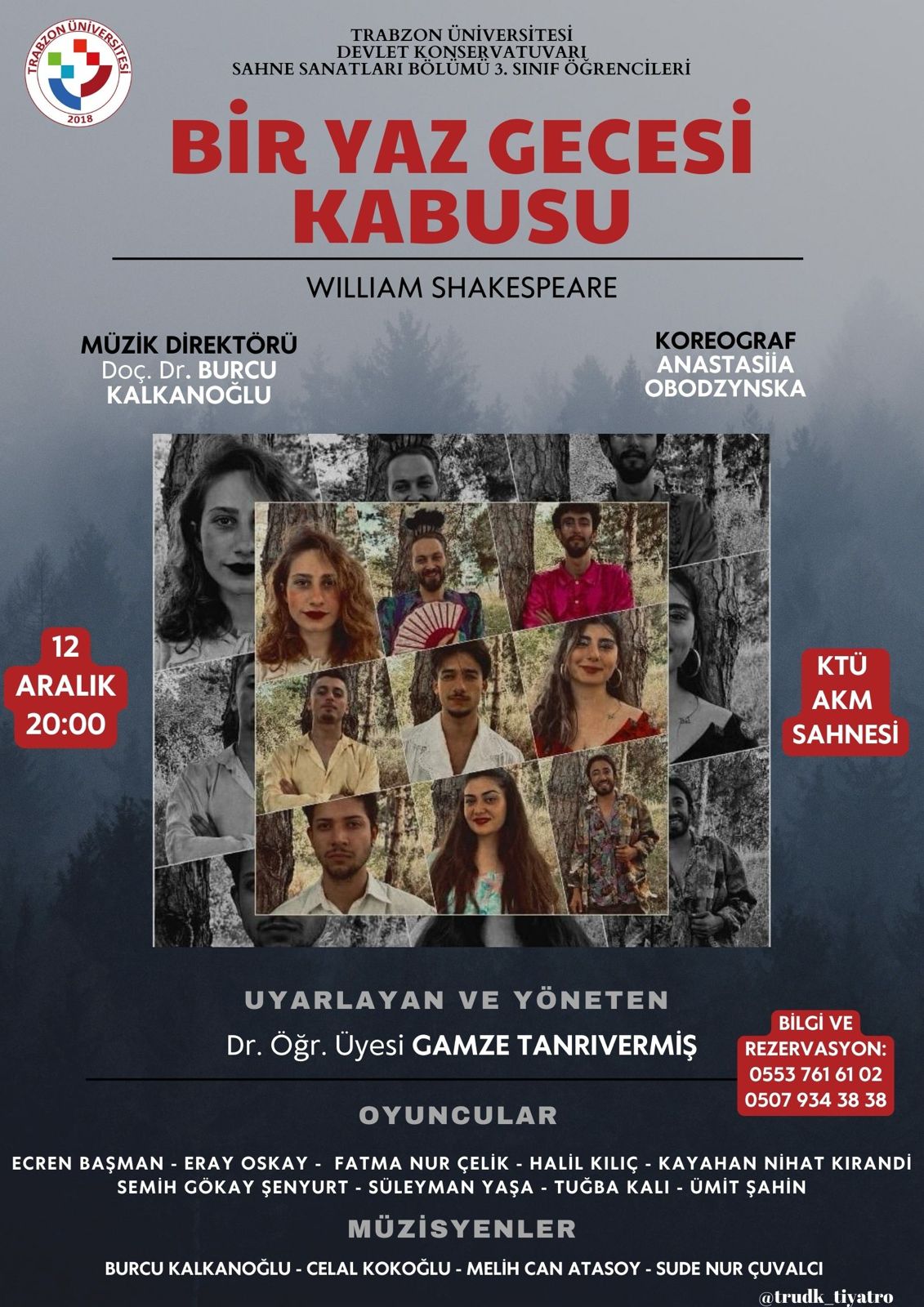 Trabzon Üniversitesi Devlet Konservatuarı Sahne Sanatları Bölümü 3. sınıf öğrencilerinin sahneleyeceği ‘’Bir Yaz Gecesi Kabusu’’ adlı müzikli komedi, 12 Aralık’ta Karadeniz Teknik Üniversitesi Atatürk Kültür Merkezi (KTÜ AKM) Sahnesi’nde izleyiciyle buluşacak.