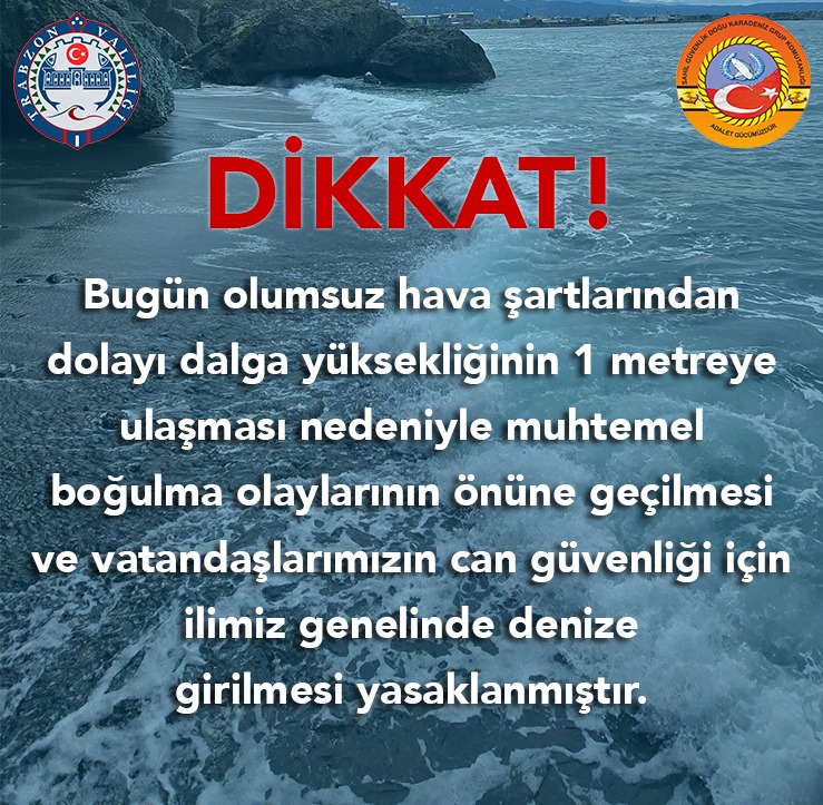 “Bugün olumsuz hava şartlarından dolayı dalga yüksekliğinin 1 metreye ulaşması nedeniyle muhtemel boğulma olaylarının önüne geçilmesi ve vatandaşlarımızın can güvenliği için ilimiz genelinde denize girilmesi yasaklanmıştır.”