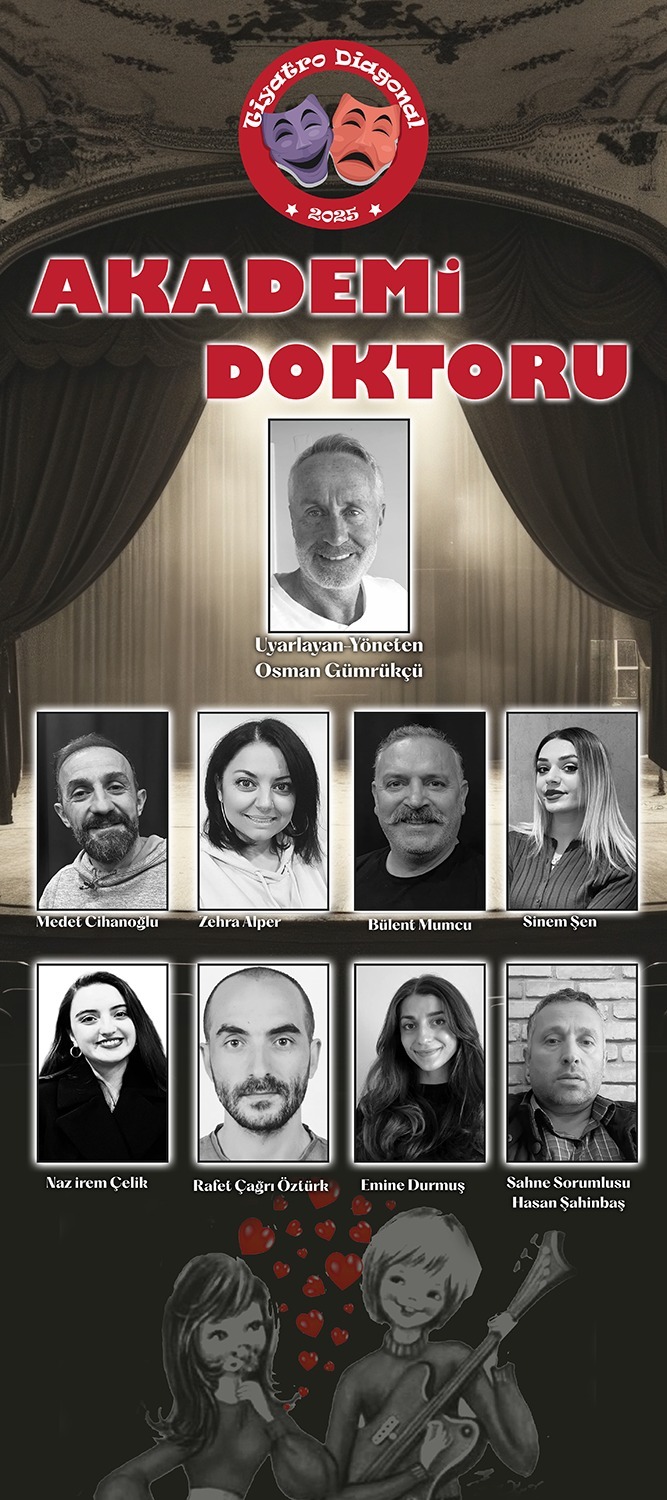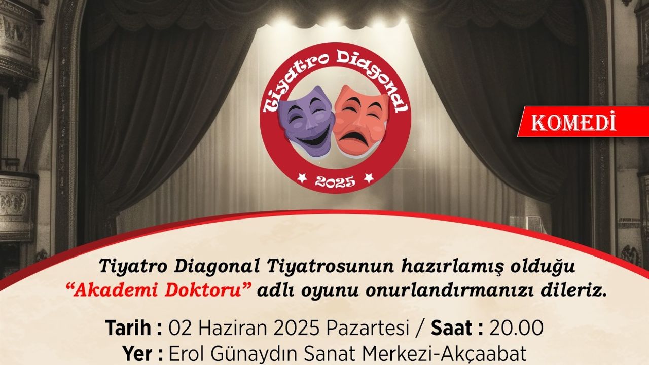 Kuruluş aşamalarını tamamlayan Tiyatro Diyagonal, Osman Gümrükçü’nün yönetmenliğinde ilk oyunu olan “Akademi Doktoru”nun hazırlıklarını tamamladı. Osman Gümrükçü’nün uyarlayıp yönettiği komedi türündeki oyunda Medet Cihanoğlu, Zehra Alper, Bülent Mumcu, Sinem Şen, Naz İrem Çelik, Rafet Çağrı Öztürk ve Emine Durmuş rol alıyor. Oyun, 2 Haziran 2025 Pazartesi günü saat 20.00'de Akçaabat Erol Günaydın Sanat Merkezi'nde prömiyer yapacak.
