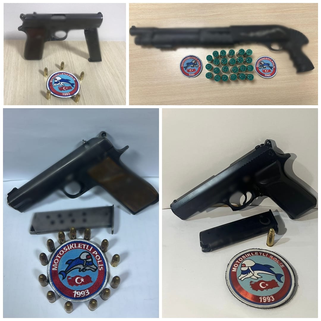 8 adet ruhsatsız tabanca, 10 adet şarjör, 2 adet ruhsatsız tüfek, 1 adet kelebek tabir edilen bıçak, 190 adet çeşitli çaplarda fişek ele geçirilmiş, 4 şüpheli hakkında adli işlem başlatılmıştır.