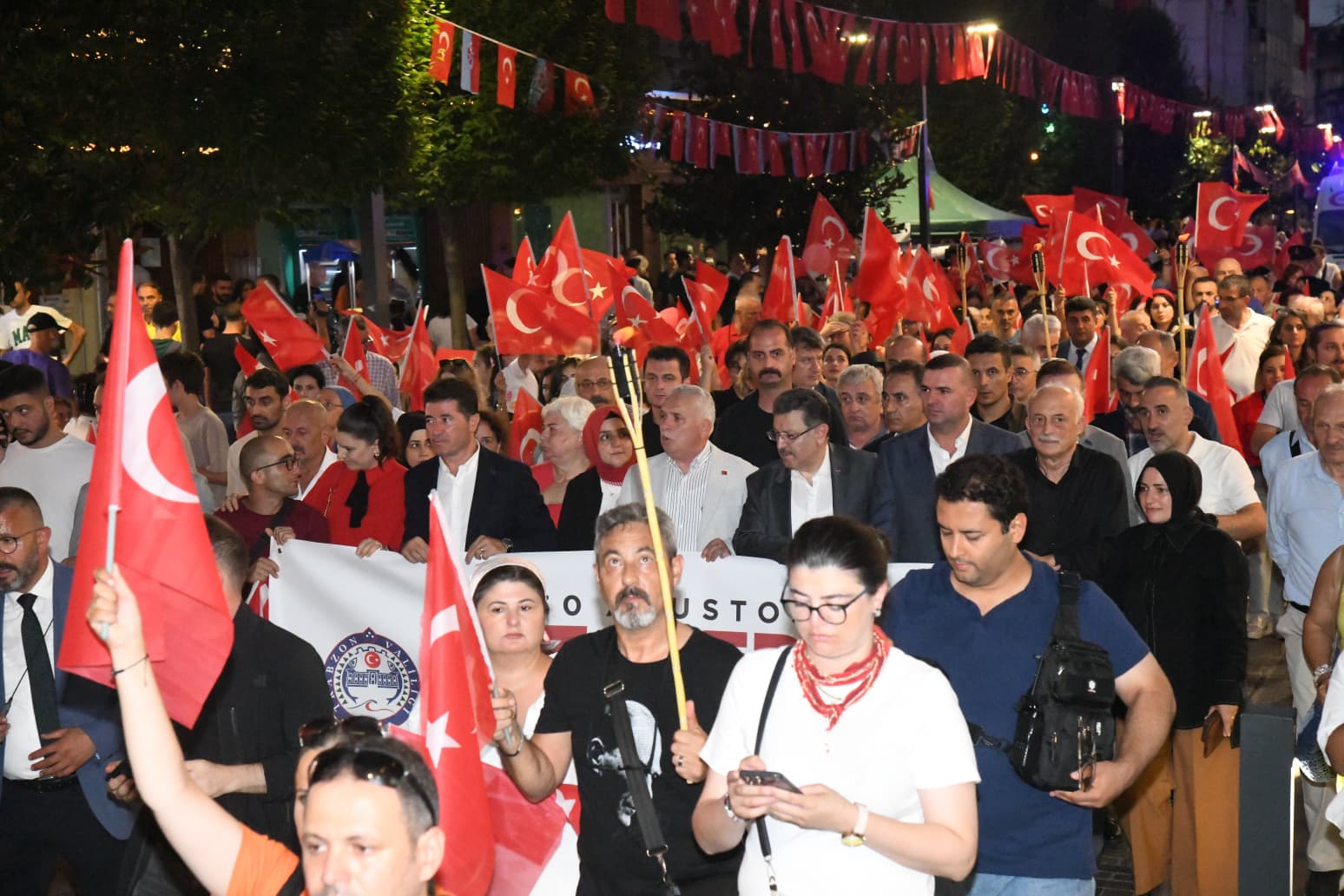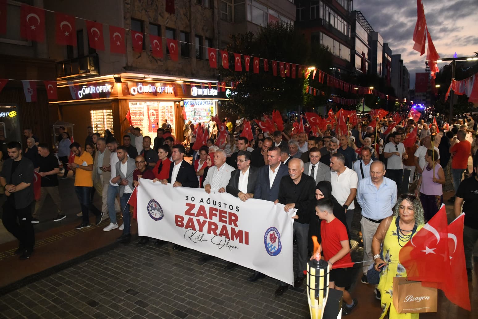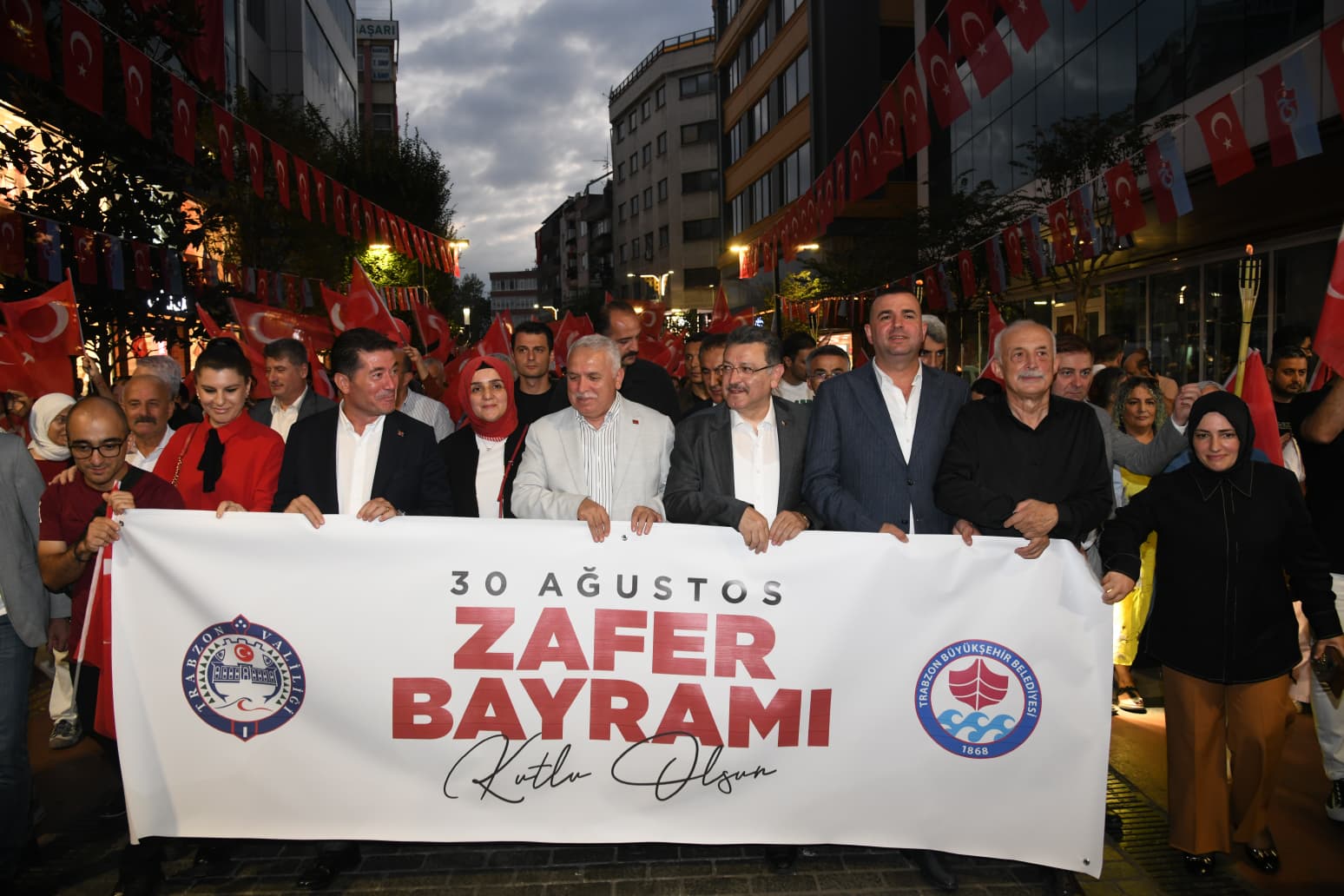 Trabzon'da 30 Ağustos Zafer Bayramı'nın 103. yıl dönümü kutlamaları kapsamında fener alayı yürüyüşü yapıldı. Kahramanmaraş Caddesi’nde başlayan ve Atatürk Alanı’nda son bulan yürüyüşe, Vali Aziz Yıldırım ve Büyükşehir Belediye Başkanı Ahmet Metin Genç'in yanı sıra, kent protokolü ve binlerce vatandaş katıldı. Ellerinde Türk bayrakları ve fenerlerle yürüyen katılımcılar, büyük bir coşkuyla bağımsızlığımızın sembolü olan Zafer Bayramı’nı kutladı.