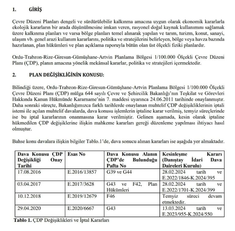 Çevre Düzeni Planı Değişikliği, Danıştay İdari Dava Daireleri Kurulunun 13 Mart 2024 tarihinde kesinleşen mahkeme kararlarının mekansal planlara yansımasıdır. Bakanlık, mahkeme kararlarına uygun bir şekilde plan değişikliği gerçekleştirerek hukukun üstünlüğünü benimsemiştir. Bakanlığın, geç de olsa mahkeme kararlarına uygun plan değişikliği yapması takdirle karşılanmaktadır.