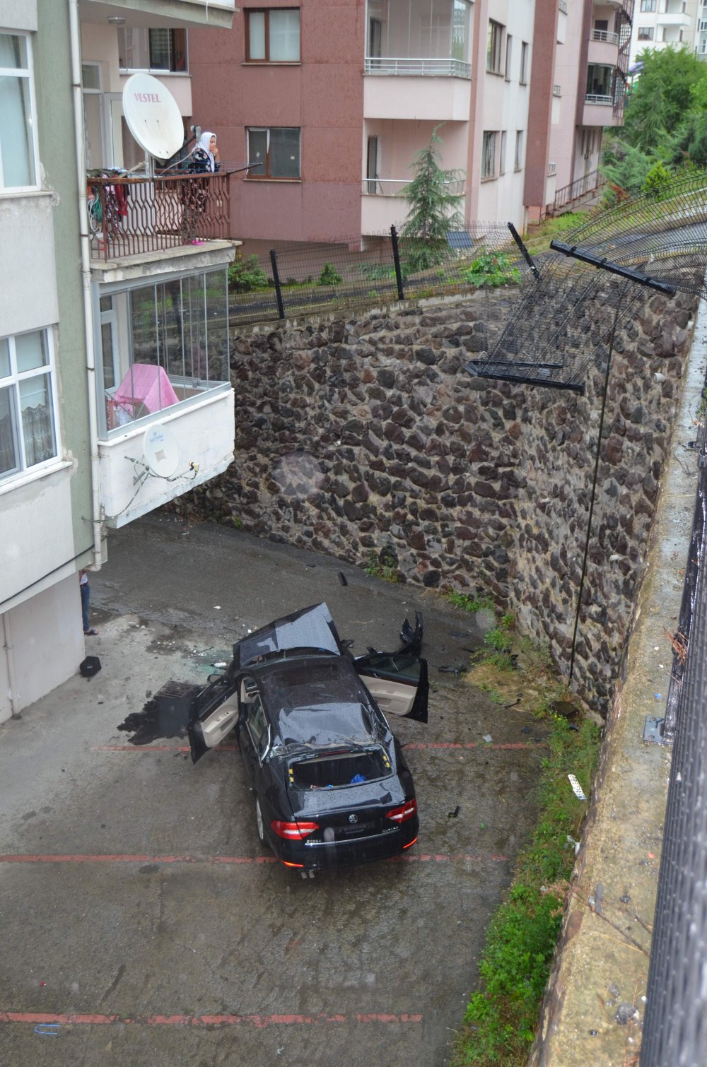 Trabzon’un 2 Nolu Beşirli Mahallesinde meydana gelen kazada çarpmanın etkisiyle yaklaşık 6 metre yükseklikten bir sitenin bahçesine düşen otomobilde sürücü yaralanırken, bahçede kimsenin olmayışı faciayı önledi.