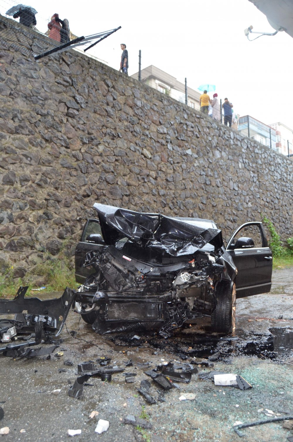 Çarpışmanın etkisiyle yaklaşık 5-6 metrelik duvardan önce sitedeki binanın balkonuna ardından da bahçeye düşen 61 AG 969 plakalı otomobil sürücüsü yaralanırken, otomobilin düştüğü yerde kimsenin bulunmaması olası faciayı önledi.