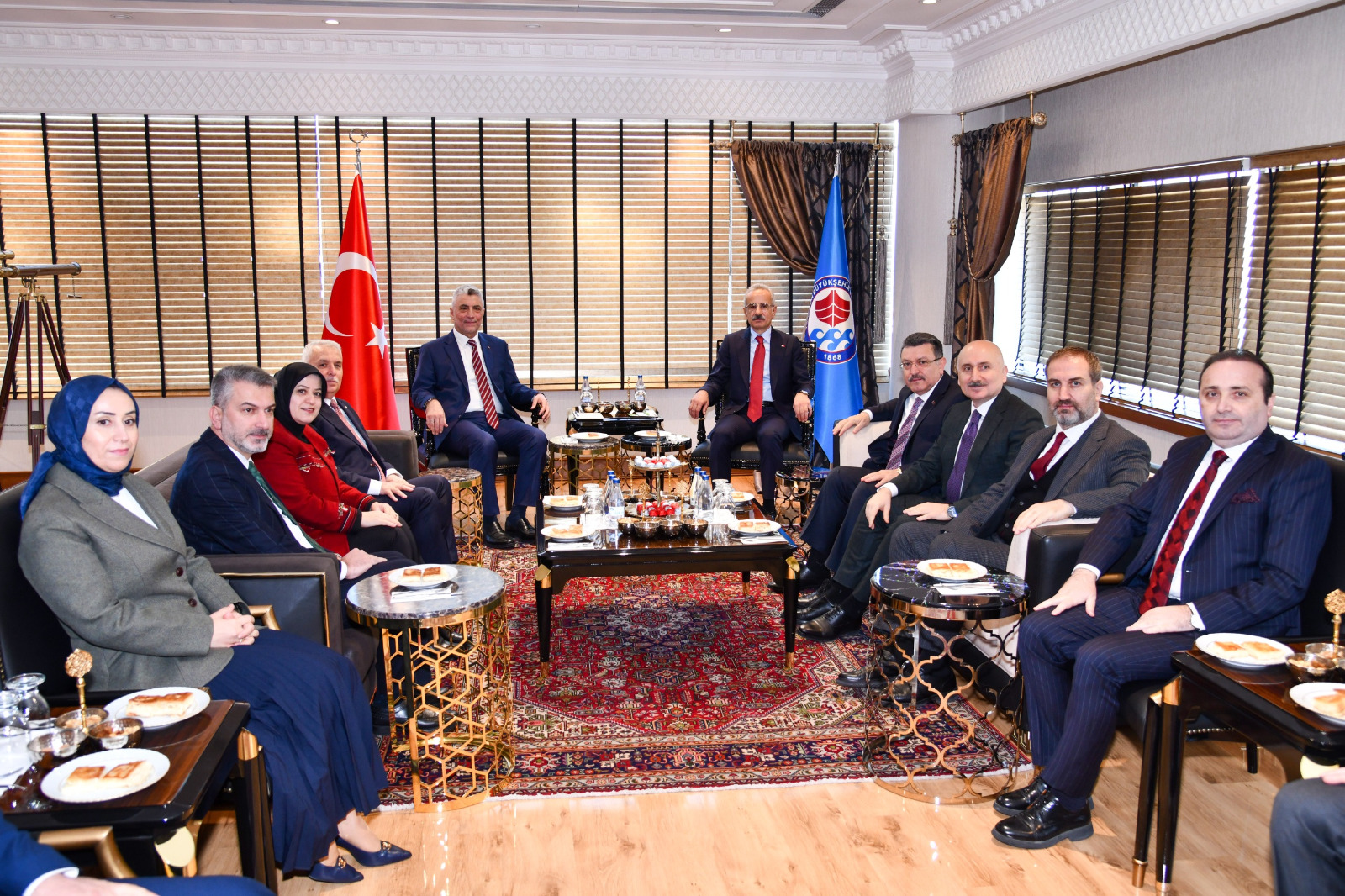 Bir dizi programlara katılmak üzere Trabzon'a gelen Ulaştırma ve Altyapı Bakanı Abdulkadir Uraloğlu ve Ticaret Bakanı Ömer Bolat’ın Büyükşehir Belediye Başkanı Ahmet Metin Genç'i ziyaretlerine; Trabzon Valisi Aziz Yıldırım, önceki dönem Ulaştırma ve Altyapı Bakanı ve Trabzon Milletvekili Adil Karaismailoğlu, AK Parti Genel Başkan Yardımcısı ve Trabzon Milletvekili Mustafa Şen, AK Parti Yerel Yönetimler Başkan Yardımcısı Trabzon eski Milletvekili Ayşe Sula Köseoğlu, ilçe belediye başkanları, AK Parti İl Başkanı Sezgin Mumcu ve AK Parti Kadın Kolları Başkanı Ayfer Cihan eşlik etti. Bakanlara ziyaretlerinden dolayı teşekkür eden Başkan Genç, şehirde devam eden ve yapılması planlanan projelerle ilgili bilgi verdi. Bakan Uraloğlu ve Bakan Bolat Trabzon’un her zaman yanında olacaklarını ve projelere destek vermeye devam edeceklerini söyledi. Ziyaret, hediye takdimi, bakanların şeref defterini imzalaması ve hatıra fotoğrafı çekilmesinin ardından sona erdi.