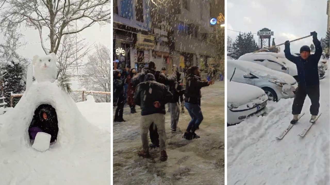Trabzon’da geçtiğimiz günlerde başlayan ve dün gece saatlerinden itibaren şehir merkezinde etkisini arttıran kar yağışı eğlenceye dönüştü. Şehir merkezinin beyaza büründüğü Trabzon’da vatandaşlar sokağa çıkarak karın tadını çıkardı. Mahalle ve sokak aralarındaki rampalarda gencinden yaşlısına karın yağmasına fırsat bilenler naylon poşetlerle kayarken, şehrin en işlek caddelerinden biri olan Uzun sokakta da vatandaşlar Ankara havası, kolbastı ve horon oynadı. Bazı vatandaşlar ise kayak takımları ile sokakları adeta piste çevirdi.