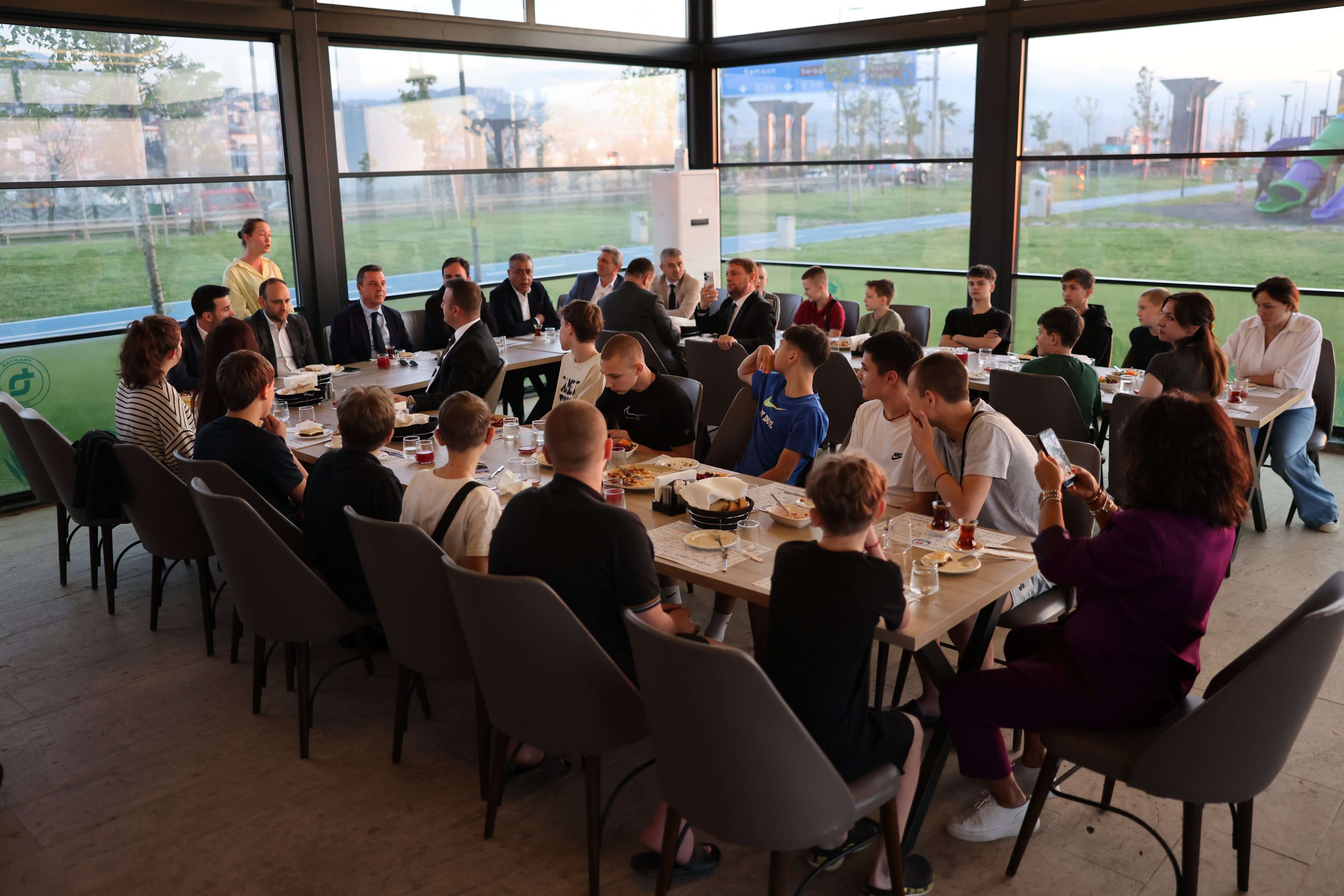 Trabzon Büyükşehir Belediyesi ve ilçe belediyelerinin katkılarıyla hayata geçirilen organizasyon kapsamında, Trabzonspor Başkan Yardımcıları Kemal Ertürk ve Murat İskender ile Genel Sayman Derviş Köz, Trabzon Büyükşehir Belediyesi Tesisleri’nde düzenlenen akşam yemeğinde Ukraynalı çocuklarla bir araya geldi.