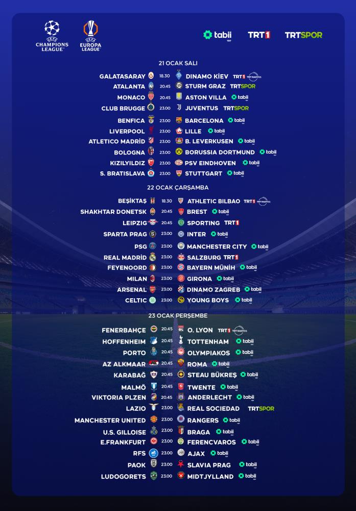 UEFA Şampiyonlar ve Avrupa Ligi 21, 22 ve 23 Ocak canlı yayın maç takvimi şu şekilde:
