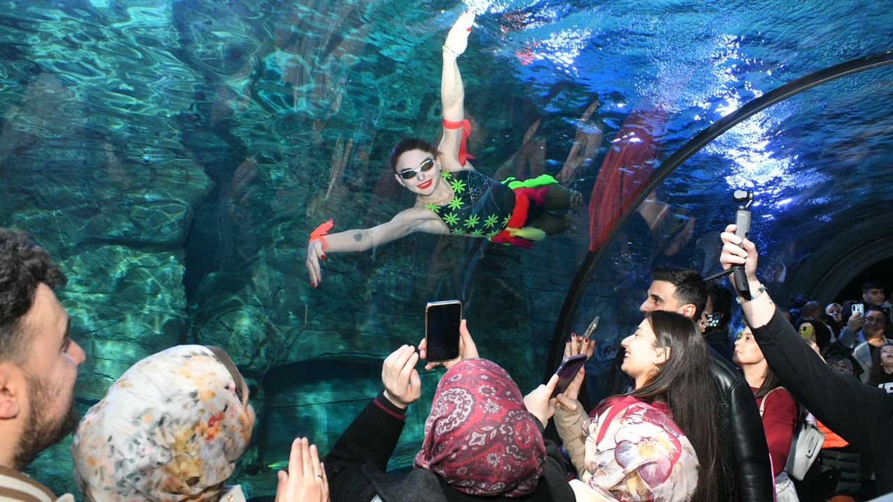 Tüpsüz şekilde balıklarla dolu akvaryuma giren sporcu, 10 dakika boyunca etkileyici bir performans sergiledi. Halkanın içinden geçme, sıçrama, ters dönme gibi su balesi tekniklerini sergileyen Deniz Kızı’nın performansına alkışlarla eşlik eden ziyaretçiler, büyüleyici gösteriyi telefonlarla görüntüleyerek kayıt altına aldı. Kendisini alkışlayan ziyaretçileri selamlayan sporcu, akvaryumun camına yaklaşarak çocuklarla fotoğraf çekildi.