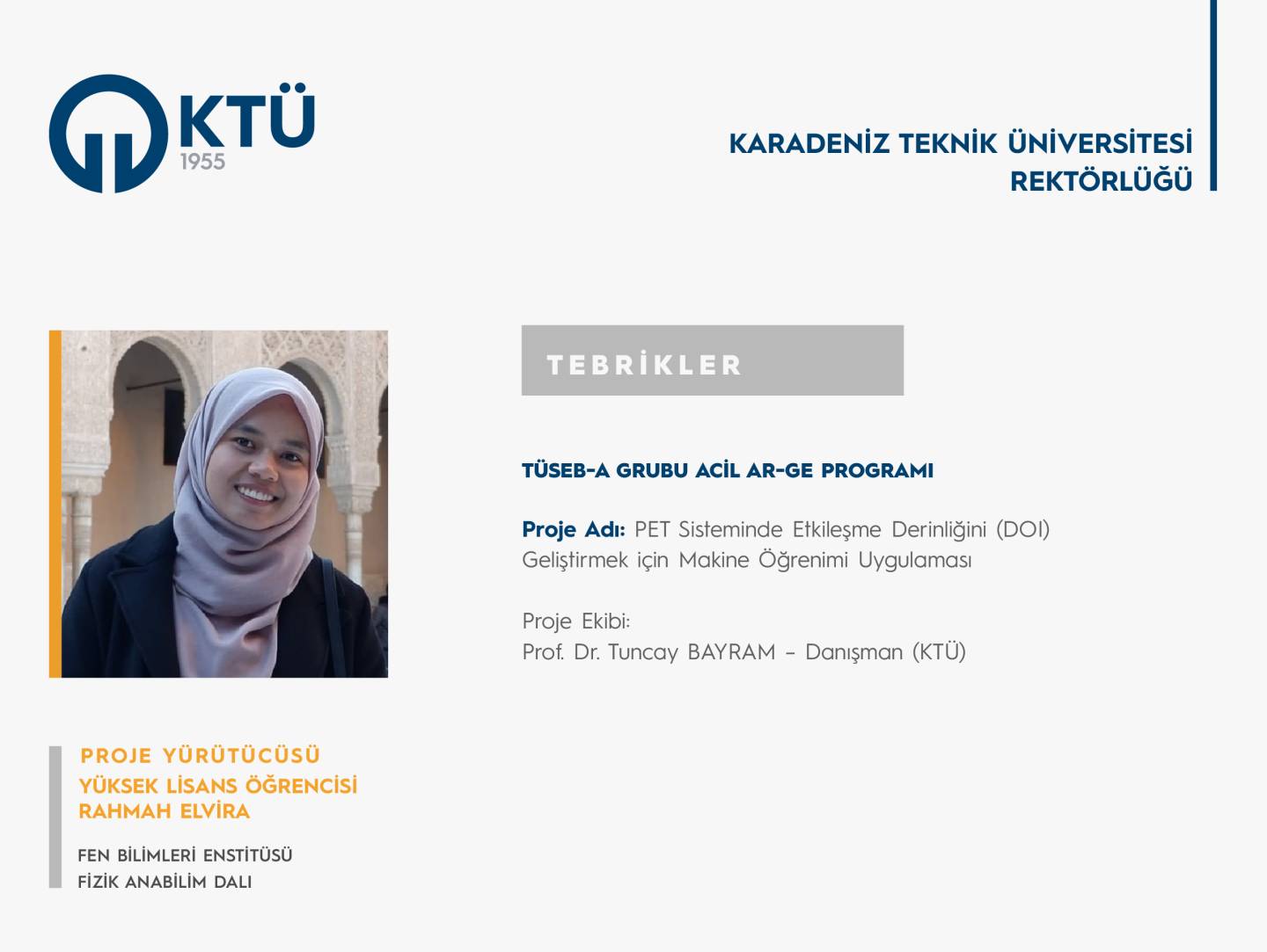 KTÜ Fen Bilimleri Enstitüsü Fizik Anabilim Dalı Yüksek Lisans Programı öğrencisi Rahmah Elvıra’nın, Fen Fakültesi Fizik Bölümü Öğretim Üyesi Prof. Dr. Tuncay Bayram danışmanlığında yürüttüğü “PET Sisteminde Etkileşme Derinliği (DOI) Geliştirmek İçin Makine Öğrenimi Uygulaması” başlıklı proje önerisi ile