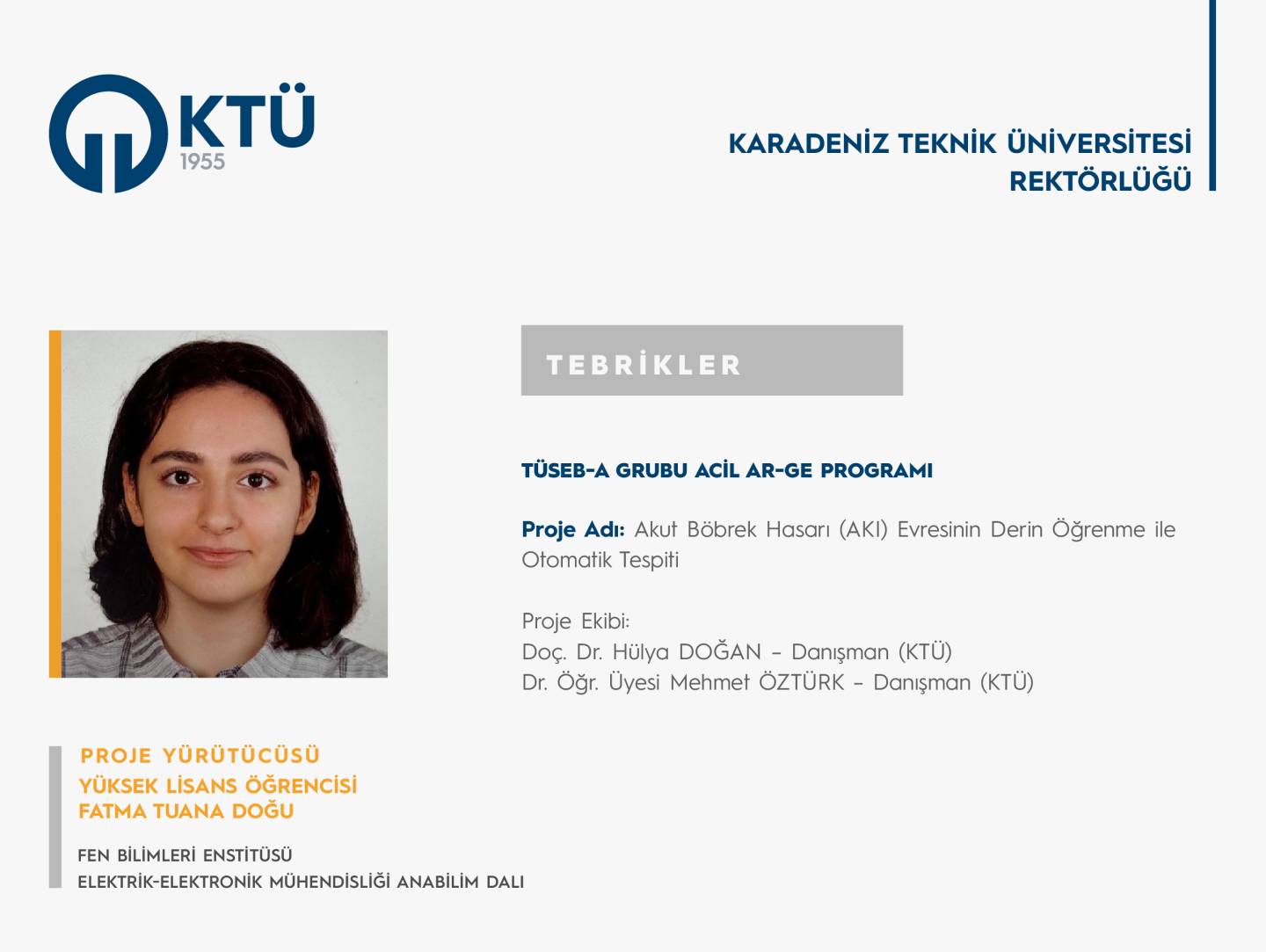 KTÜ Yüksek Lisans öğrencisi Fatma Tuana Doğu’nun, Mühendislik Fakültesi Yazılım Mühendisliği Bölümü’nden Öğretim Üyesi Doç Dr. Hülya Doğan ve Elektrik Elektronik Mühendisliği Bölümü’nden Dr. Öğr. Üyesi Mehmet Öztürk danışmanlığında yürüttüğü “Akut Böbrek Hasarı (AKI) Evresinin Derin Öğrenme ile Otomatik Tespiti” başlıklı proje önerisi