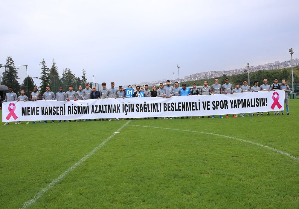 Trabzonsporlu Futbolcular ve teknik heyet meme kanserine karşı farkındalık yaratmak amacıyla bugünkü antrenmana “Meme kanseri riskini azaltmak için sağlıklı beslenmeli ve spor yapmalısın!” pankartıyla çıktı.